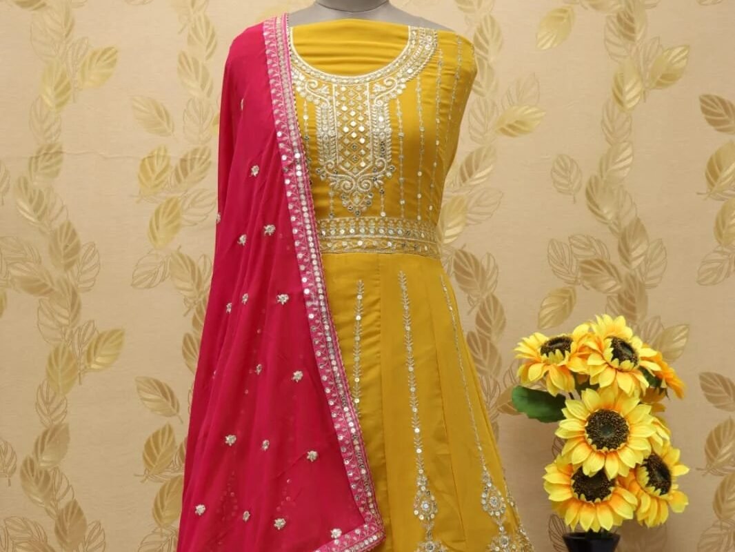 Radiate elegance in this beautiful mustard yellow anarkali gown. The dress is decorated with shimmering gold embroidery and delicate mirror work, giving it a rich, festive feel. The matching dupatta in bright pink provides a pop of color, making this an ideal choice for celebrations, from daytime events to evening parties.